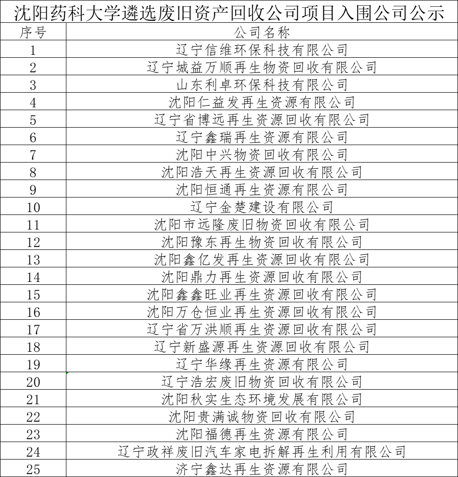 经我校审核,沈阳药科大学遴选废旧资产回收公司项目入围公司名单如下。合作期间如遇政策调整,按照新政策执行。